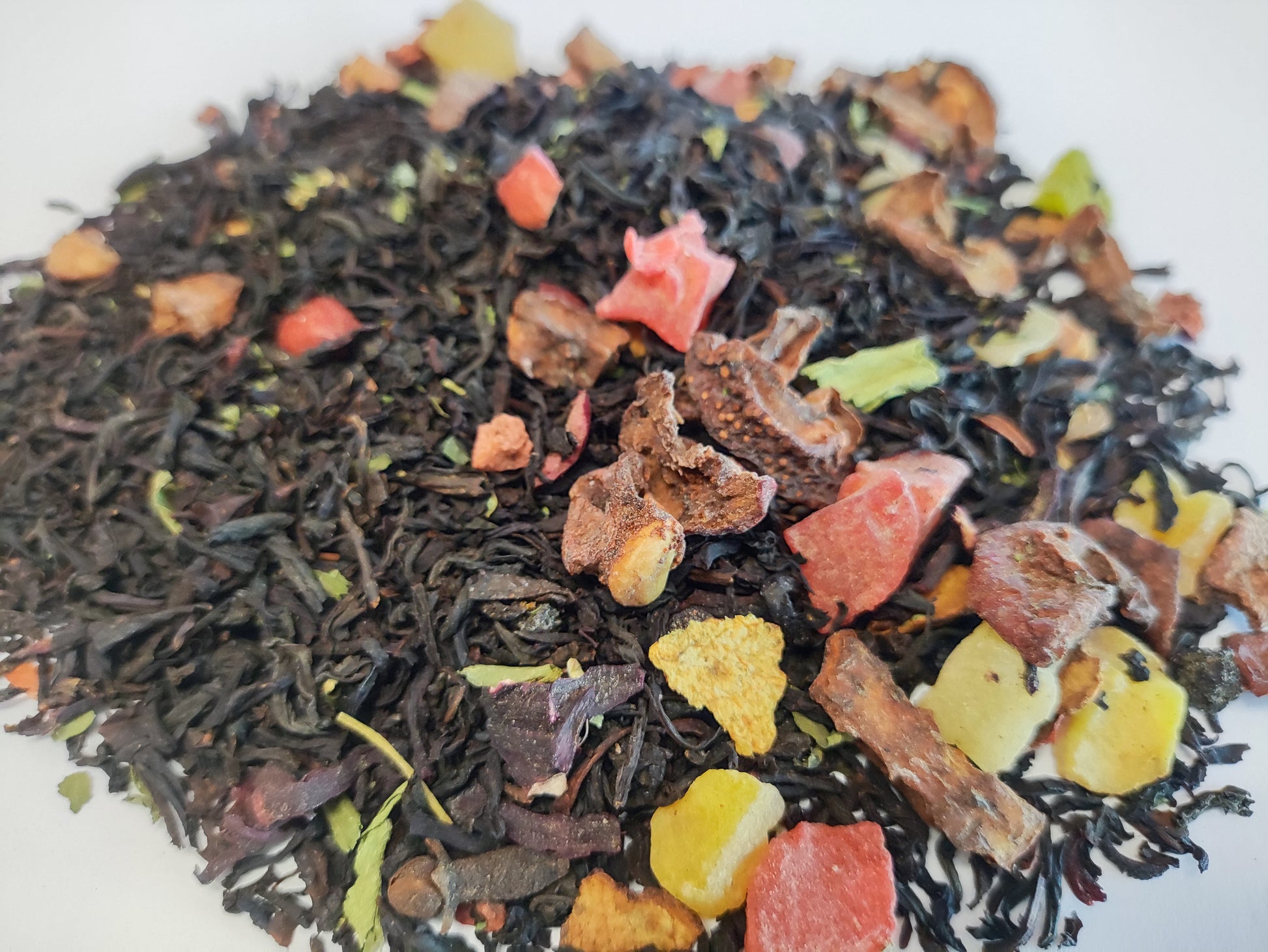 The blood orange also gives the tea its spooky red color due to the presence of anthocyanin pigments typically found in red flowers, such as hibiscus, and provide the blood orange with its unique somewhat floral flavor. The citrus tang is bolstered by a combination of cinnamon, clove, cranberry, and black tea that gives spice and depth to the blend and brings all the fall goodness together.