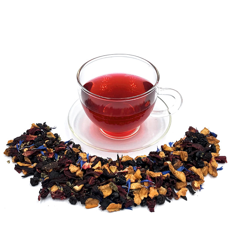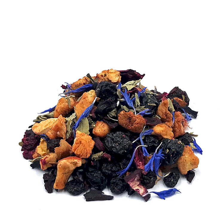 This tea we blend with hibiscus, dried apples, raisins, dried blueberries, chrysanthemum and mint.