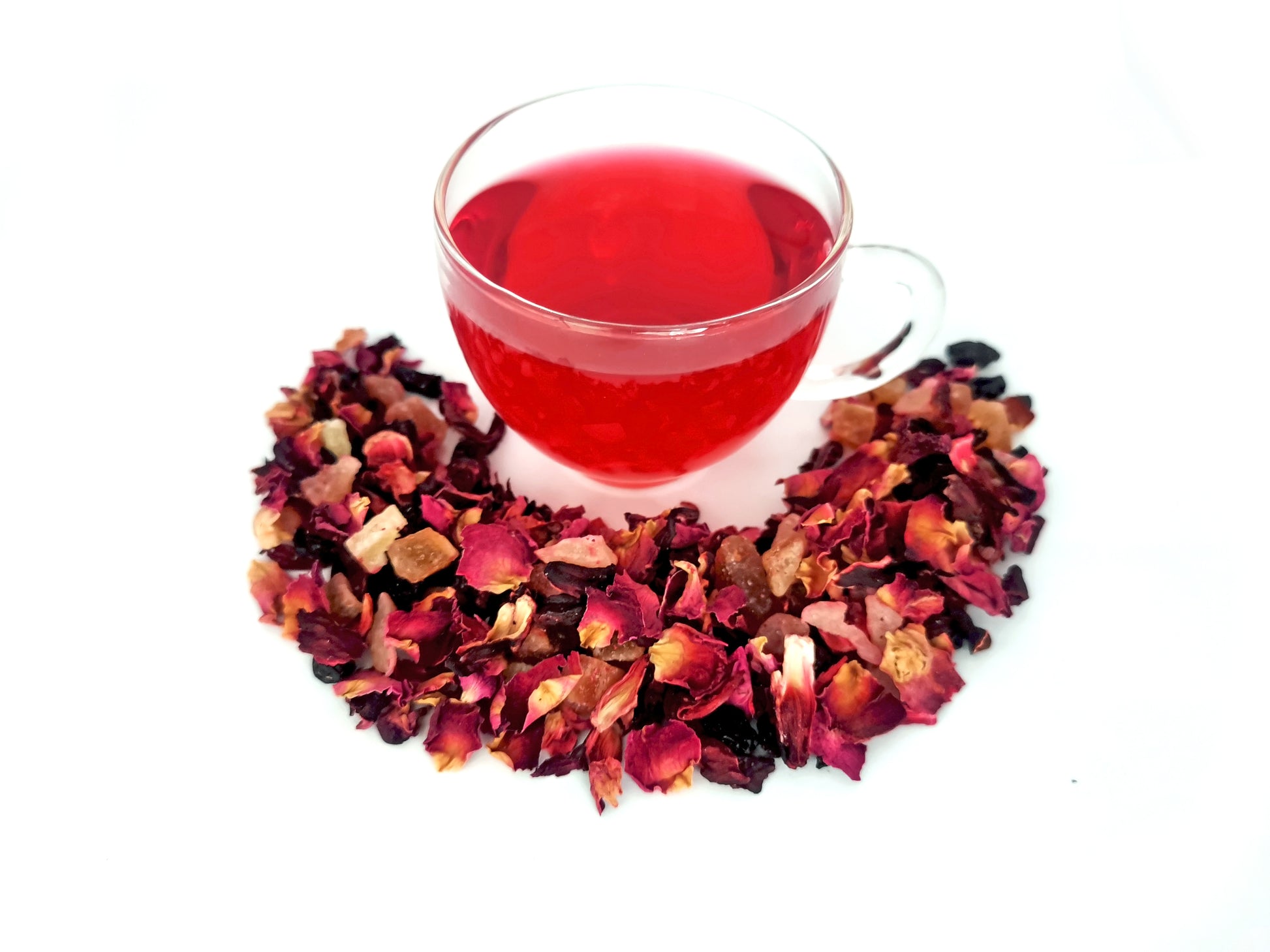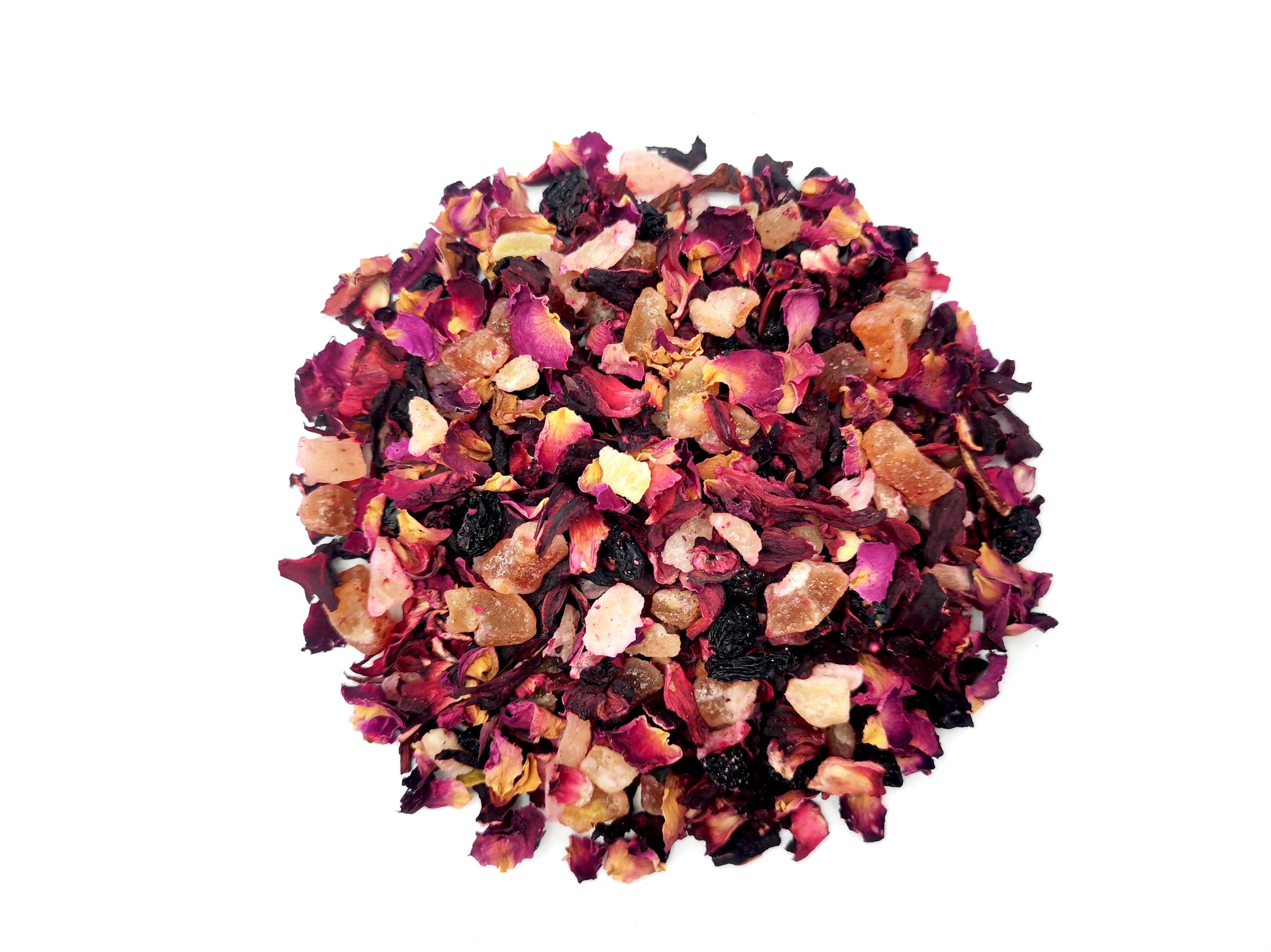 This tea we blend with hibiscus, peach cubes, pineapple cubes, raisins, dried blueberries, and red roses.