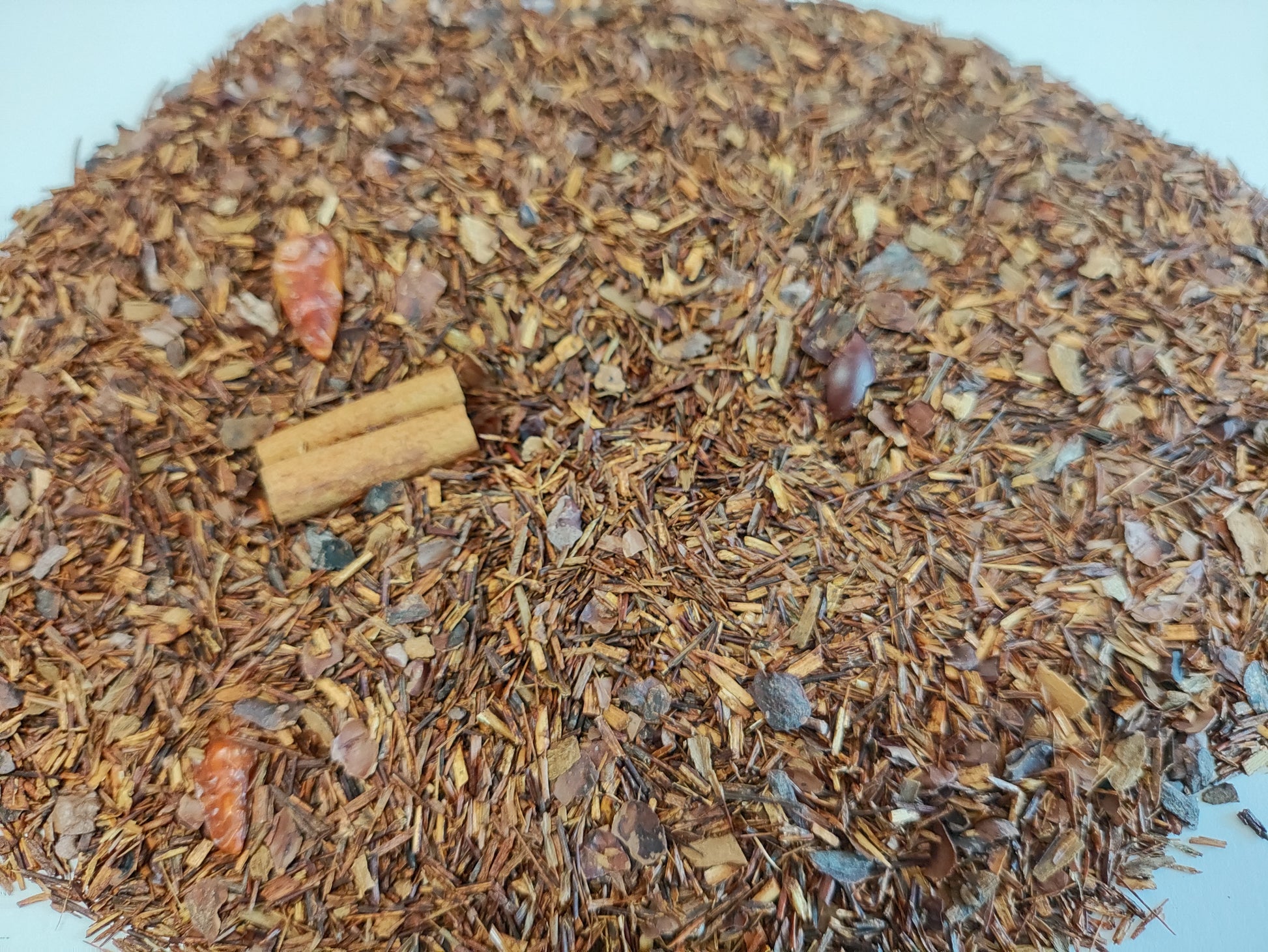 This tea is a blend of rooibos, cocoa nibs, cocoa peel, cinnamon pieces, cinnamon rods, and chili.
