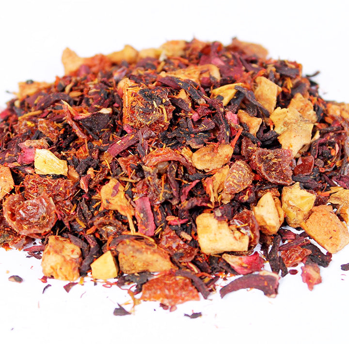 This tea we blended with apple bits,rosehip shells,hibiscus,safflowers and flavor.