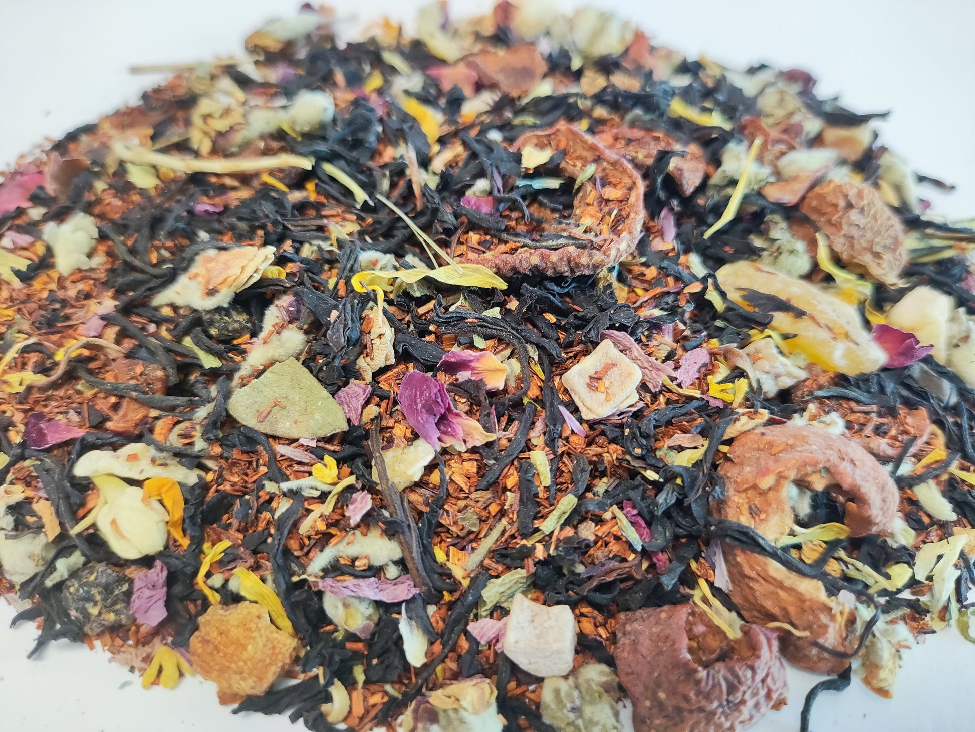 This tea is a blend of dried berries with the petals of violet, apple blossom, and jasmine. The fresh flora mixed with roobios and lady grey make for a sweet yet tart taste. Finished with a sprinkle of pixie dust this magical tea is ready to fill your cup.