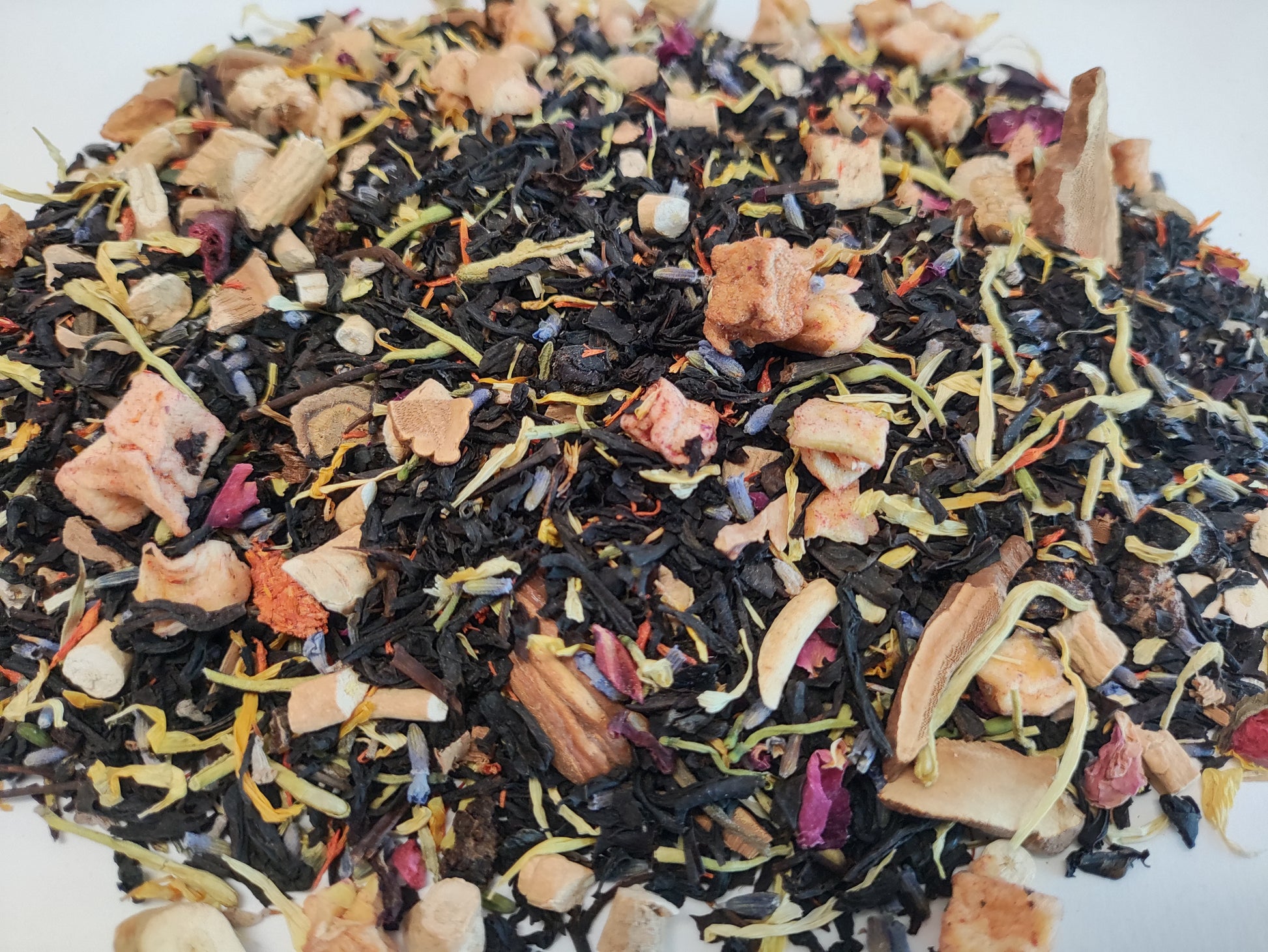 Venture through the bountiful fields of the legendary Elysium. The realm of the underworld reserved for the victorious heroes of old. This powerful botanical tea begins with rich Victoria black tea, roots of dandelion, honeysuckle and reshi mushroom. Then mixed in are the flora of lavender, safflower, marigold, and sunflower. Last for a hint of sweet, just a pinch of apple and raspberry. Together these herbs bring you a wholesome blend beneficial for gut and liver health, Anti- inflammatory, and immune boosting properties.