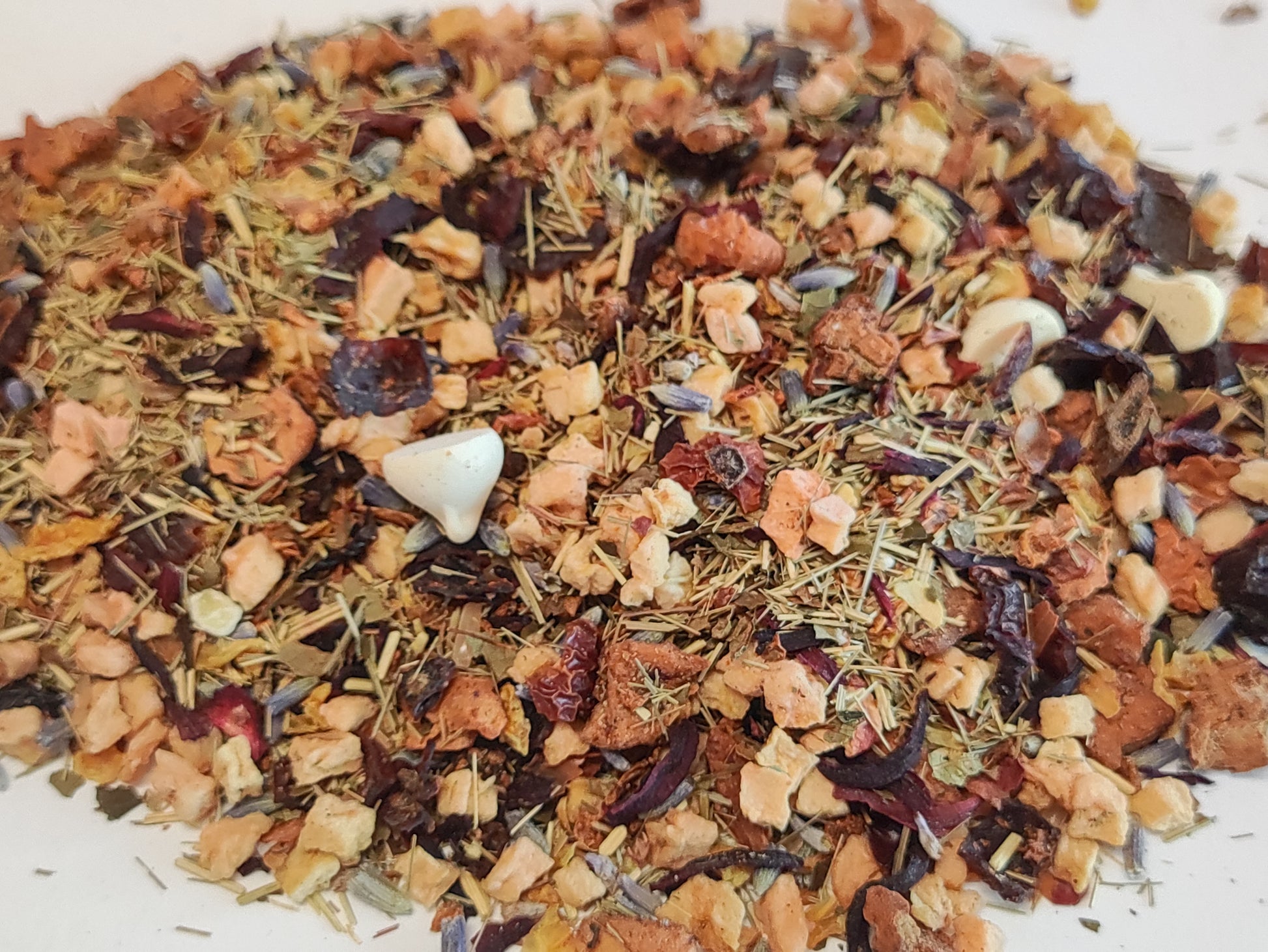 This tea is a blend of lavender, lemon peel, rose hips, hibiscus, white chocolate chips, and honeybush.