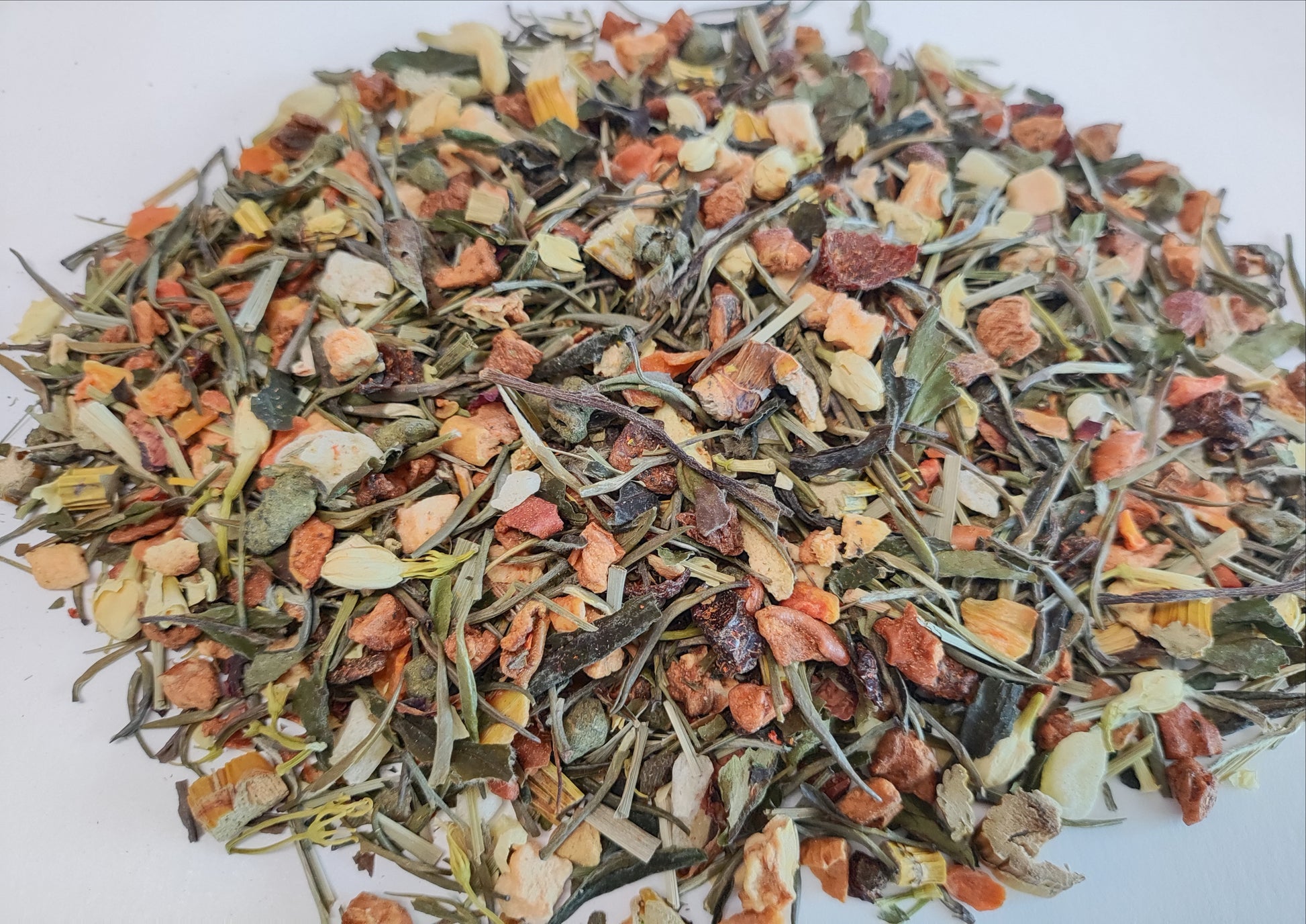 Allow this golden delight to embrace your senses and sooth your mind. This blend begins with soft white teas, Bai Mu Dan and Green Needle, then bergamot, mandarin orange, apple, pineapple, jasmine, and ginseng are added to create a smooth finish reminiscent of a rich silk.