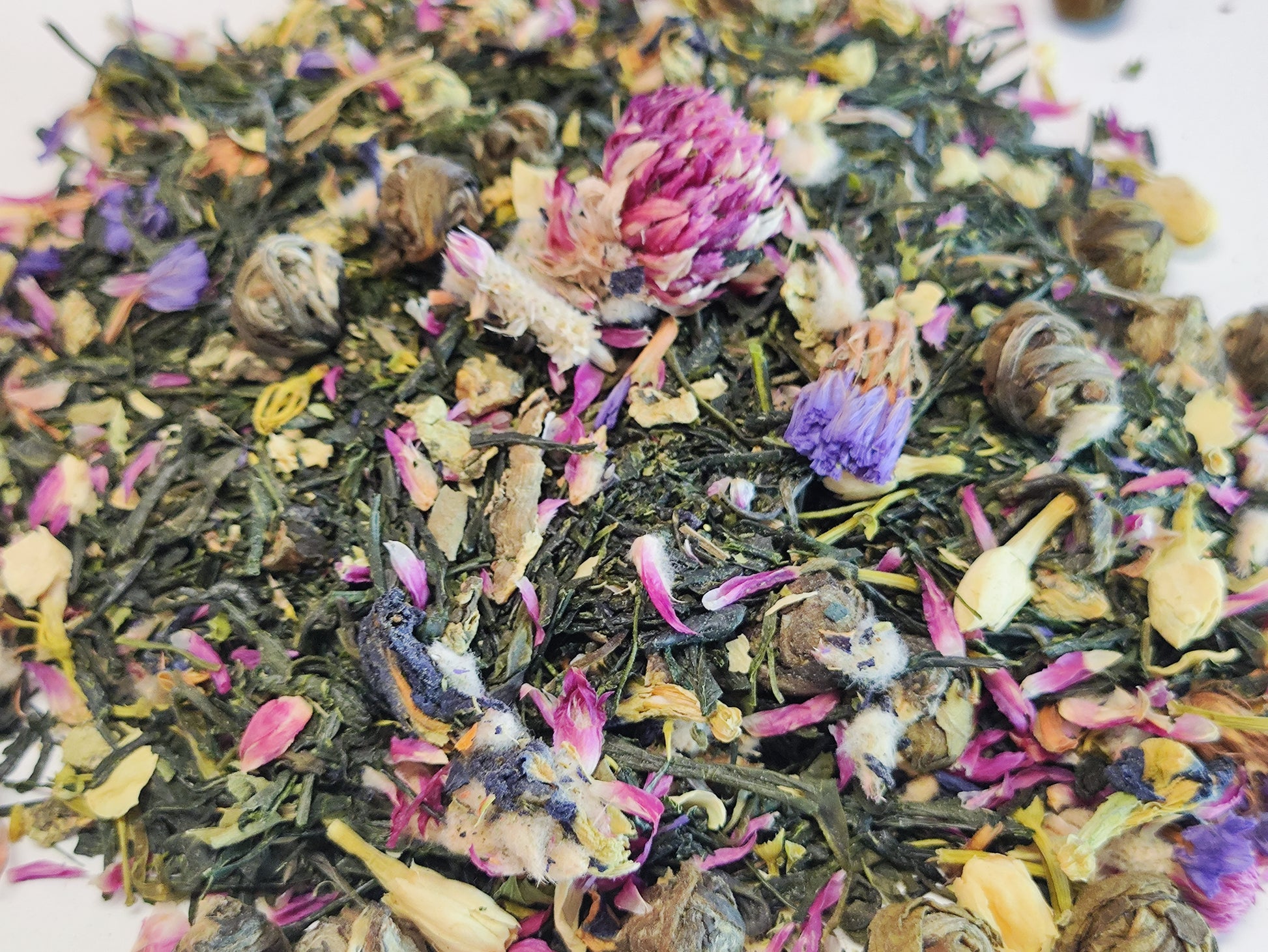 This blend creates a verdant botanical brew that transports you to a sanctuary of tranquility. Green tea also provides you with a myriad of benefits. Teeming with potent anti- oxidants, and L-theanine, green tea can improve your mood, health, and cognitive function.