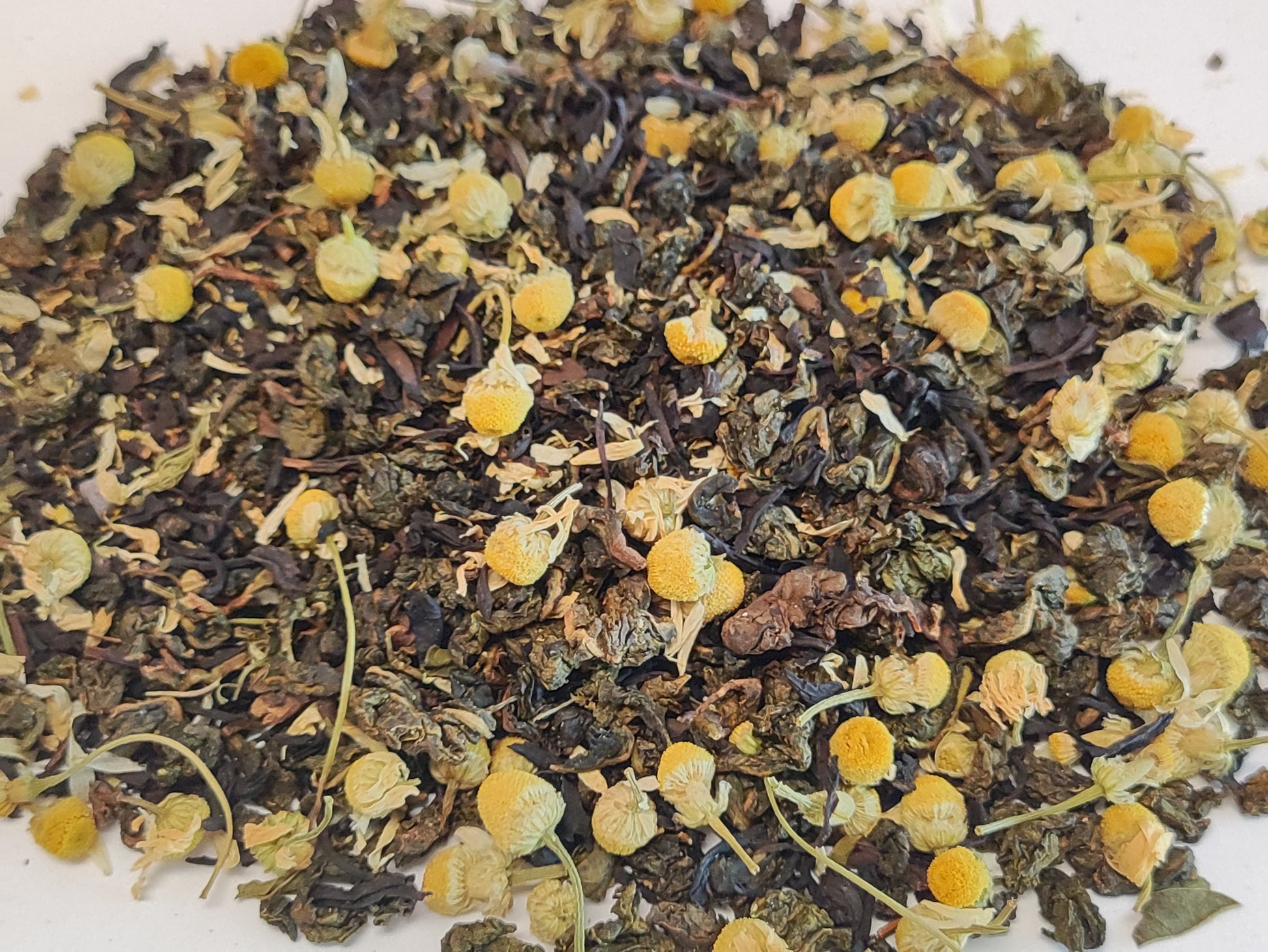 This tea is a blend of coconut oolong, chocolate mint black tea, and chamomile. A delicious sweet tea!