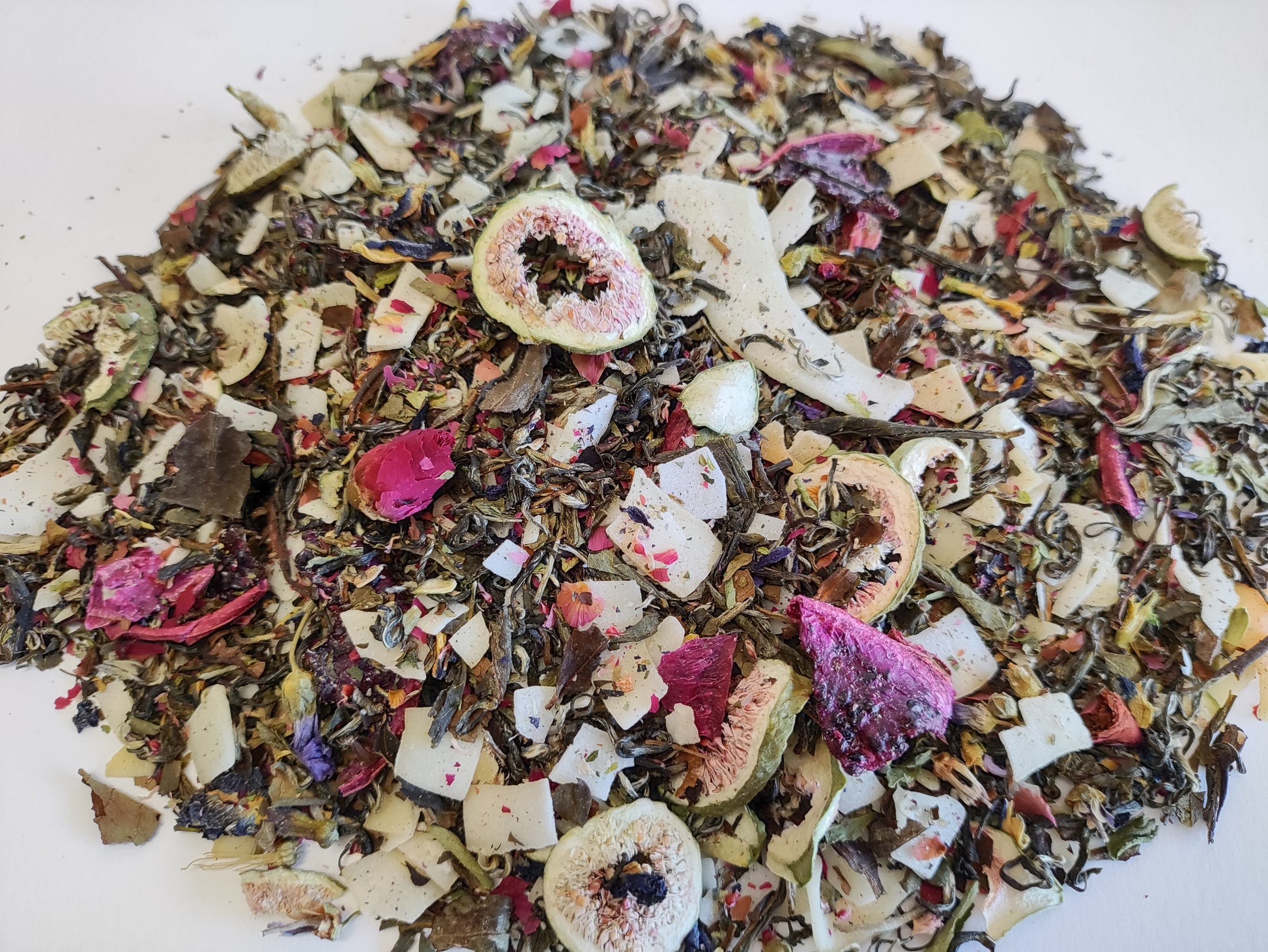 Sip the magical allure of this mystic blend. Adorned with Bi Luo Chun green tea, pomegranate white tea, bright pink dragon fruit, fig slices, coconut shavings, rose buds and a pinch of butterfly pea flower. These vibrant ingredients mimic the multi-faceted rainbow flashes of the gemstone. Together these herbs create a tea filled with anti-oxidants, and nutrients. All helpful for a healthy heart, glowing skin, and regulated digestion.
