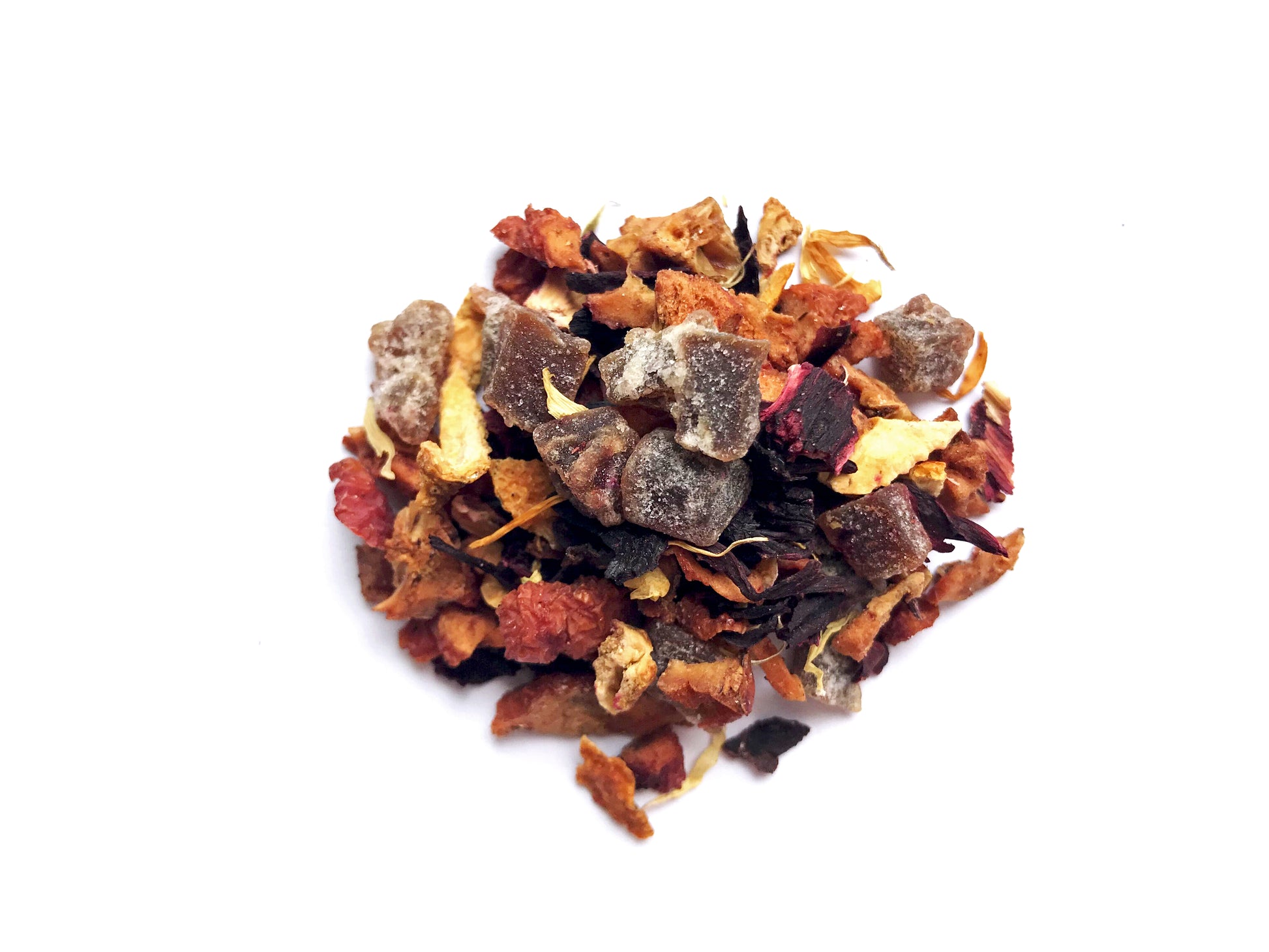 This tea we blend with hibiscus, apple cubes, peach cubes, orange peel and chrysanthemum.