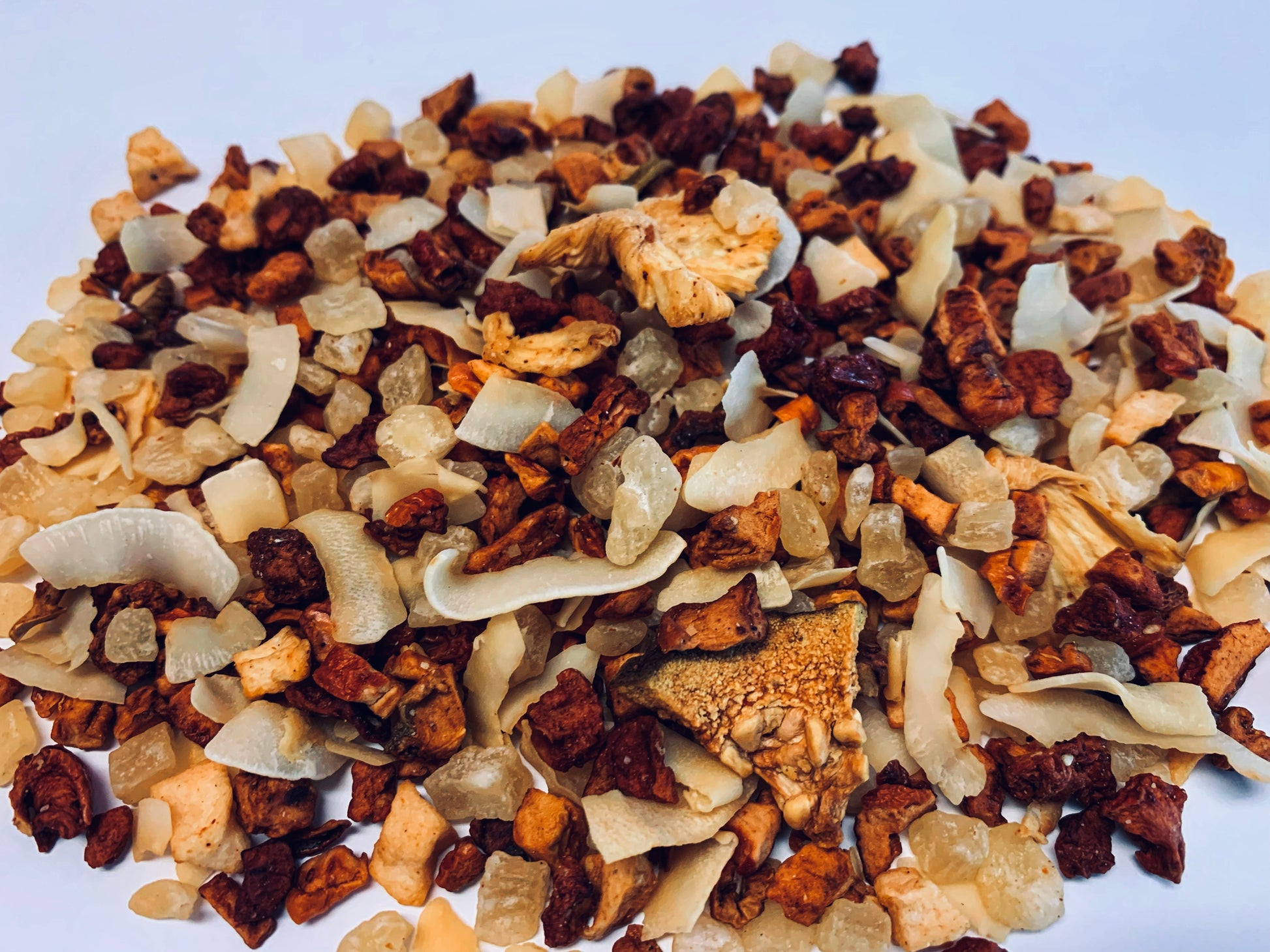 This tea is a blend of coconut pieces, pineapple cubes, and guava.