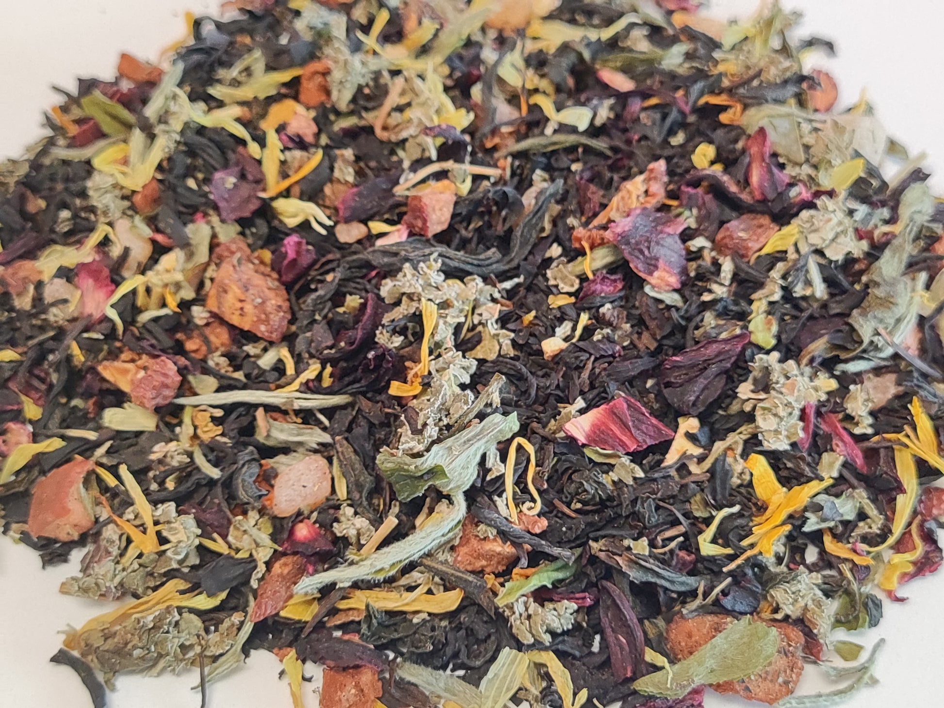 This blend offers a teeming cup of fresh florals and sweet fruits. Orchid Oolong and Raspberry black tea are deliciously accompanied by shade dried moonlight silver needle white tea. Hints of peach, marigold, and hibiscus give this tea a slightly tart yet exceptionally smooth taste. Enjoy hot, or steep as a refreshing cold brew.