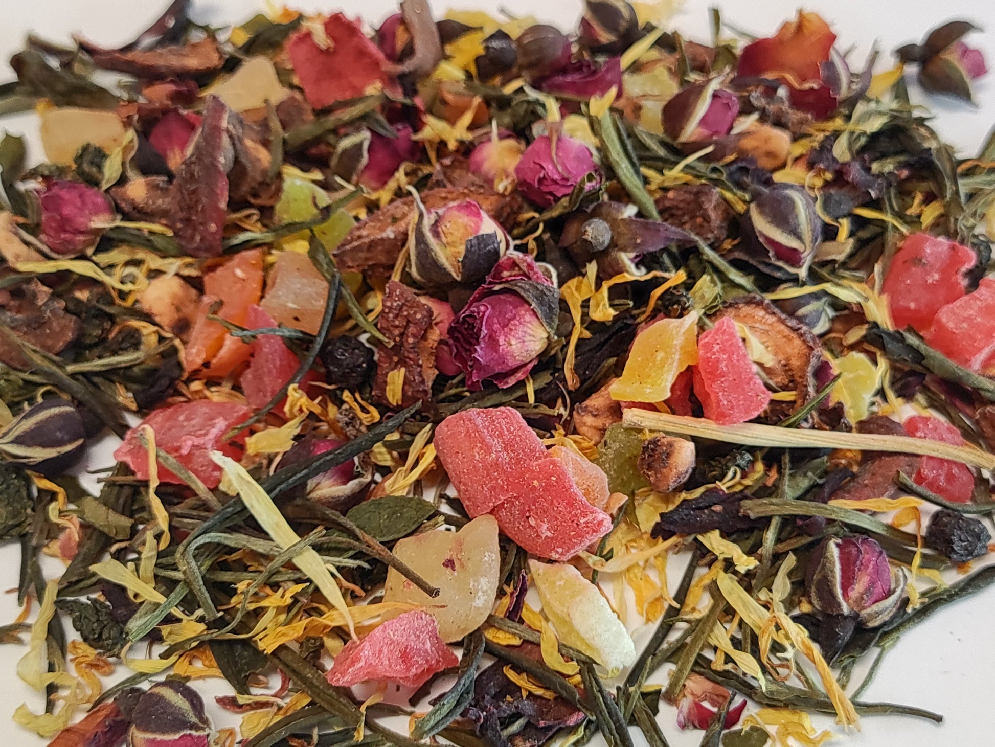 This light shimmering blend is mixed with An Ji white tea, fruit pieces, rose, marigold, and a dash of peony Oolong. A soft, mellow, relaxing tea, perfect for crisp mornings or summer sunsets.