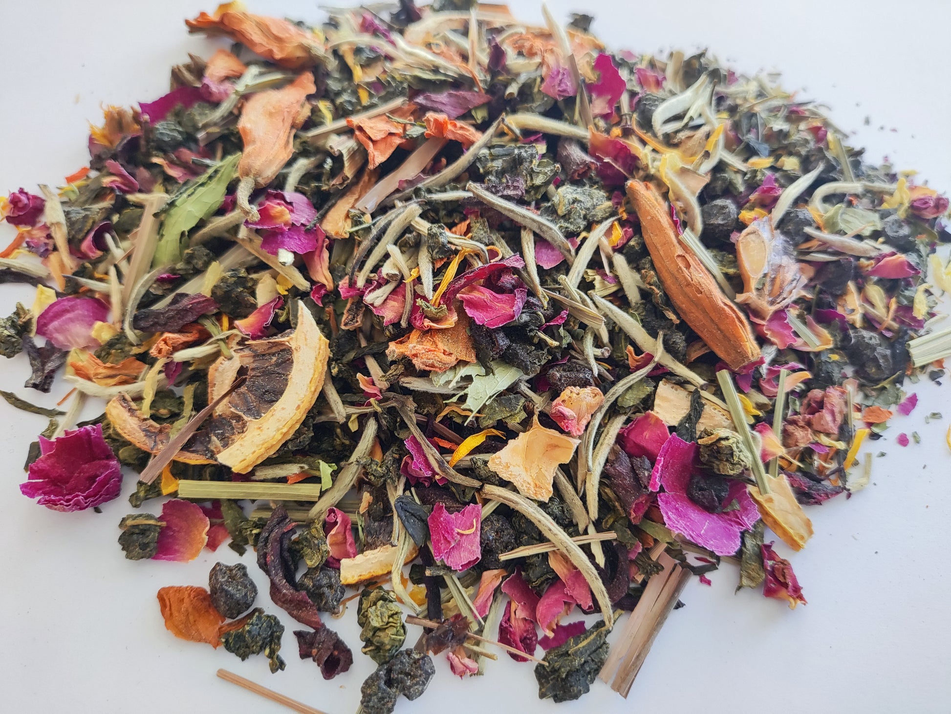 Boasting peony oolong, superfine jasmine white tea, lemon, calendula, lemongrass, roselle, and lilly, a royal bouquet of sweet yet tart splendor.