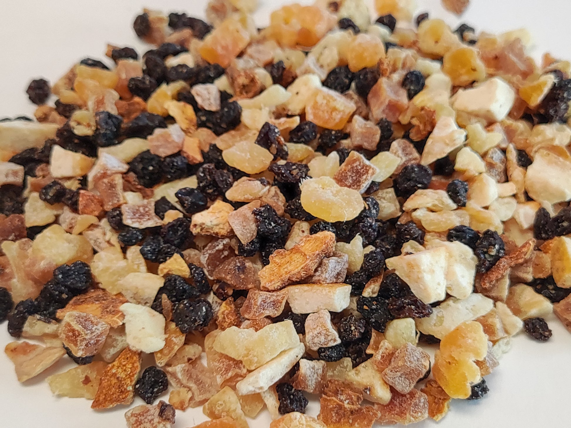 This tea is a blend of black currant, pineapple, orange, and lychee.