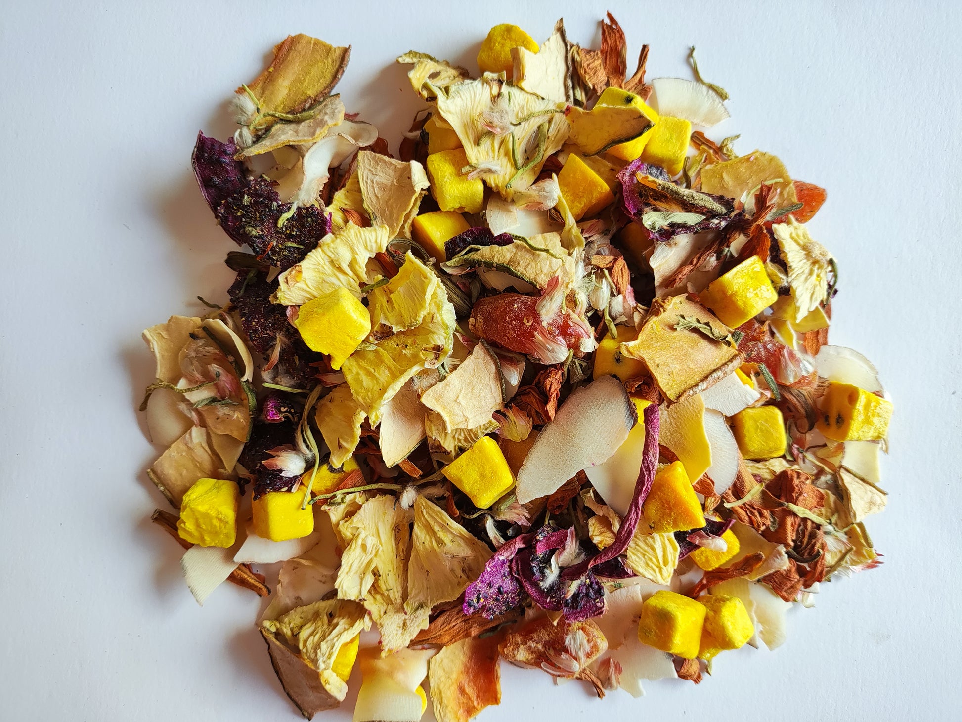 Think sunset over the ocean. This offering is beaming with a vibrant blend of color given by the many fruits and flowers inside. Passion fruit, dragon fruit, pineapple, papaya, and a hint of tart cherry, are balanced by honeysuckle, marigold, lily, and artful plum. A delicious decaf delight designed to be cold brewed and served chilled. The pigment for vermilion red originated from the mineral powder found in cinnabar. This illusive red was revered among the ancient world, used by Romans and popular in Chinese art. Personifying passion, vitality, and prosperity.