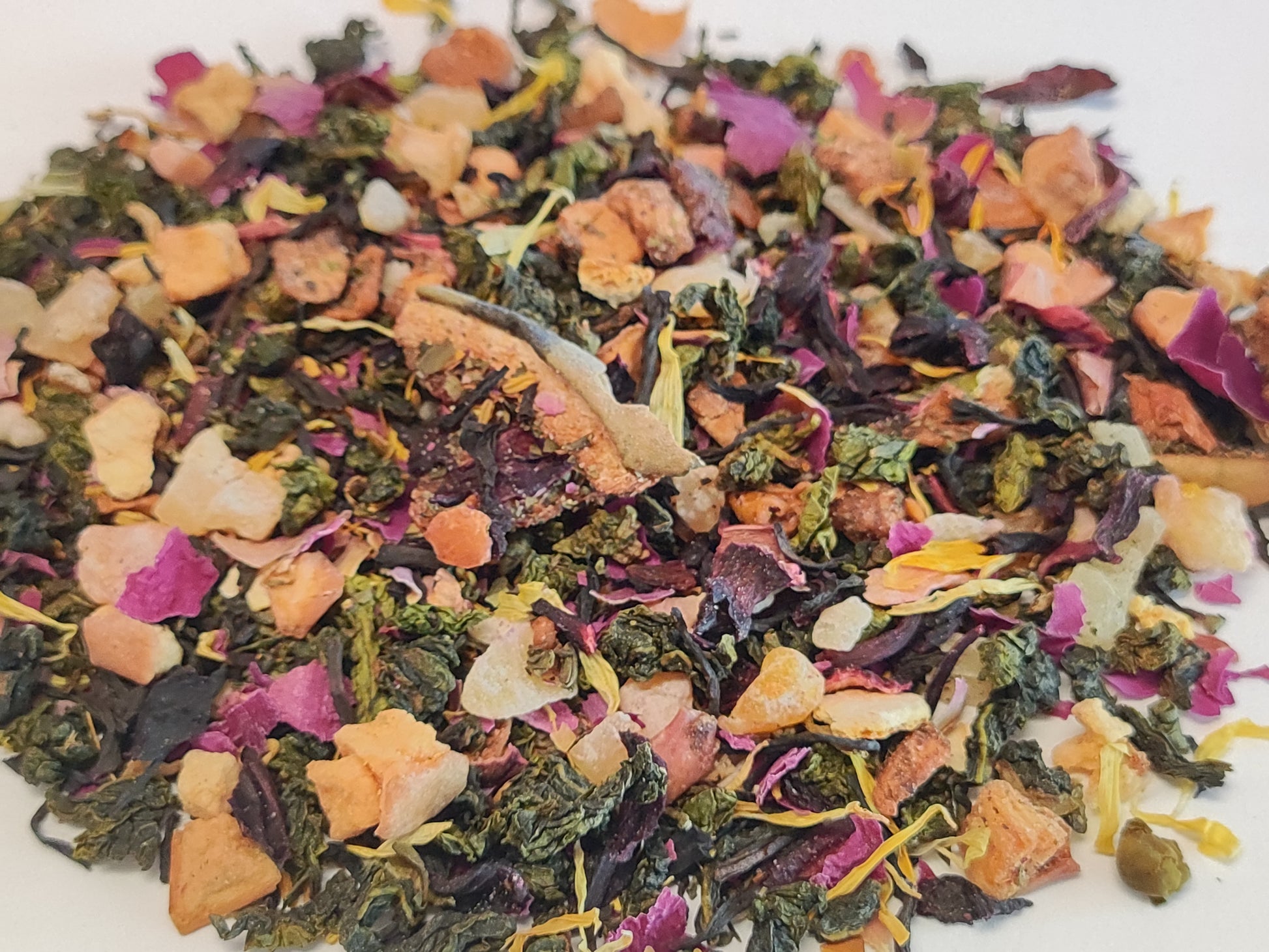 Sink your teeth into refreshing summer time blend. This tea offers a delicious combo of sweet watermelon, fresh Tie Guan Yin Oolong, lychee black tea, peony petals, and just a dash of orange dreamsicle. Together these mighty fruits pack vitamins A and C, potassium, phosphorous, and even help to support bone, heart and skin health. Watermelon and lychee are rooted in history as being fruits connected to; love, prosperity, romance, and rejuvenation. Much like the stone, tourmaline, from which this delightful tea gained its name.